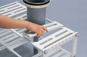 キッチンシンク下フリーラック 伸縮タイプの解説 棚板が取り外しが可能になっているので、シンク下の排水トラップを避けて棚が作れます。