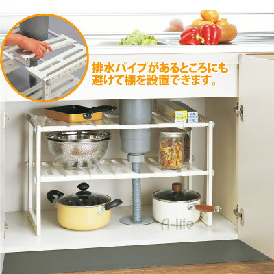 シンク下 フリーラック 伸縮 サイズ 巾50〜75×奥行30.3×高さ39.8cm耐荷重:10kg(1段あたり5kg) 材 質 フレーム:ABS、棚板・メネジ:PP、パイプ:スチール(エポキシ焼付塗装)(樹脂部:ABS) 色 ホワイト 商品説明 流し台 下 の 収納量 アップ に 棚 をつくって 簡単 に 整理 整頓 できる シンク下 フリーラック 横 伸縮 タイプ 棚板 が取り外せるので 排水トラップ を避けて 棚 がつくれます。