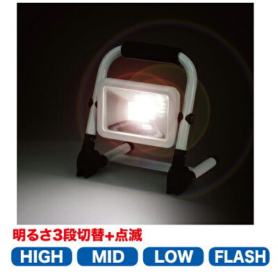 ジェフコム LED投光器(作業灯) 屋外用(IP44) 充電タイプ 折りたたみ式 20W形 色温度6500K 明るさ3段階切替+点滅 全光束:1600lm(HIGH) USB出力付き ACアダプター付属 PDSB05020S