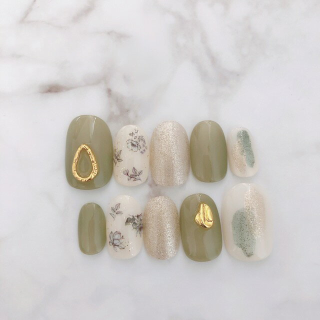 ネイルチップ つけ爪 ブライダルネイル かわいい ショート ロング デザイン 夏ネイル nail プレゼント 短い爪 小さい爪 大きい爪 ベリーショート ちび爪 大人ネイル 付け爪 オフィスネイル シンプル 【1796】ぬりかけボタニカルグリーン小花フラワー